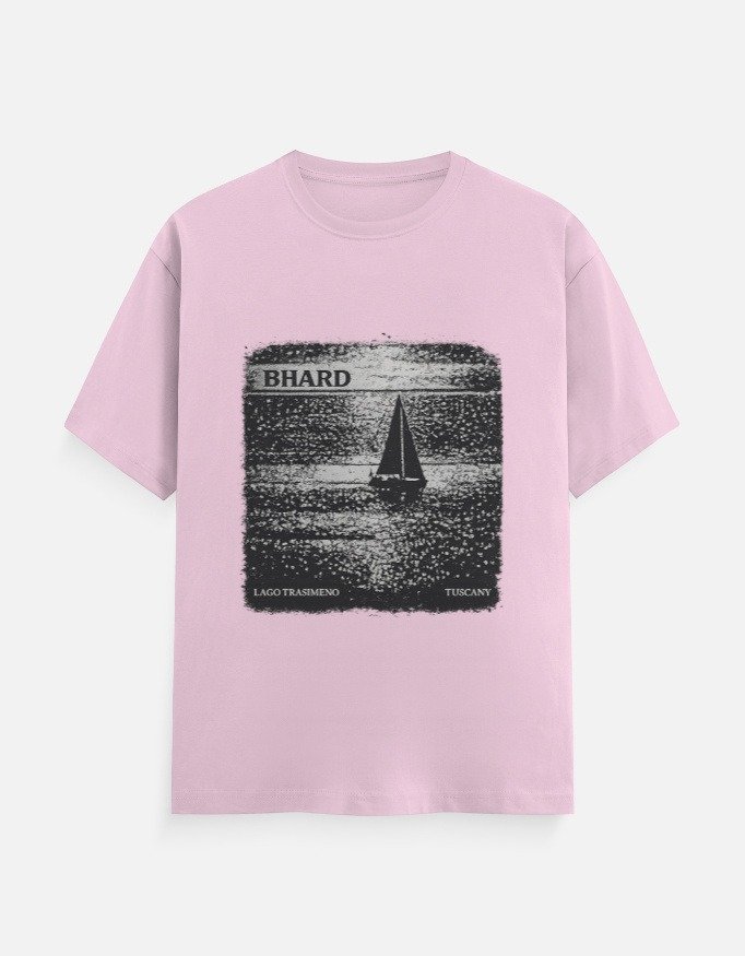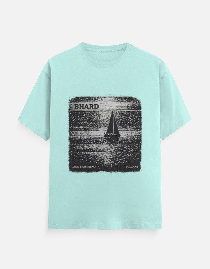 Add a touch of artistic minimalism to your wardrobe with this BHARD graphic cotton T-shirt, featuring a serene lake and sailboat print inspired by classic travel posters. The textured monochrome artwork creates a timeless, relaxed aesthetic that stands out without being loud.