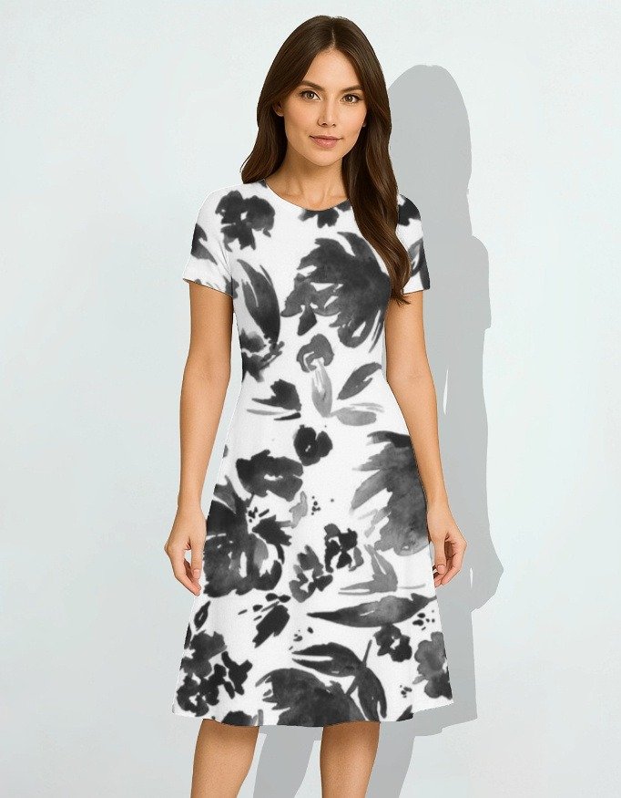 A modern essential that blends comfort, style, and performance. This women’s black & white floral fit-and-flare dress is crafted from premium 220 GSM poly-spandex, offering breathable stretch, a wrinkle-free finish, and long-lasting color for effortless all-day wear.