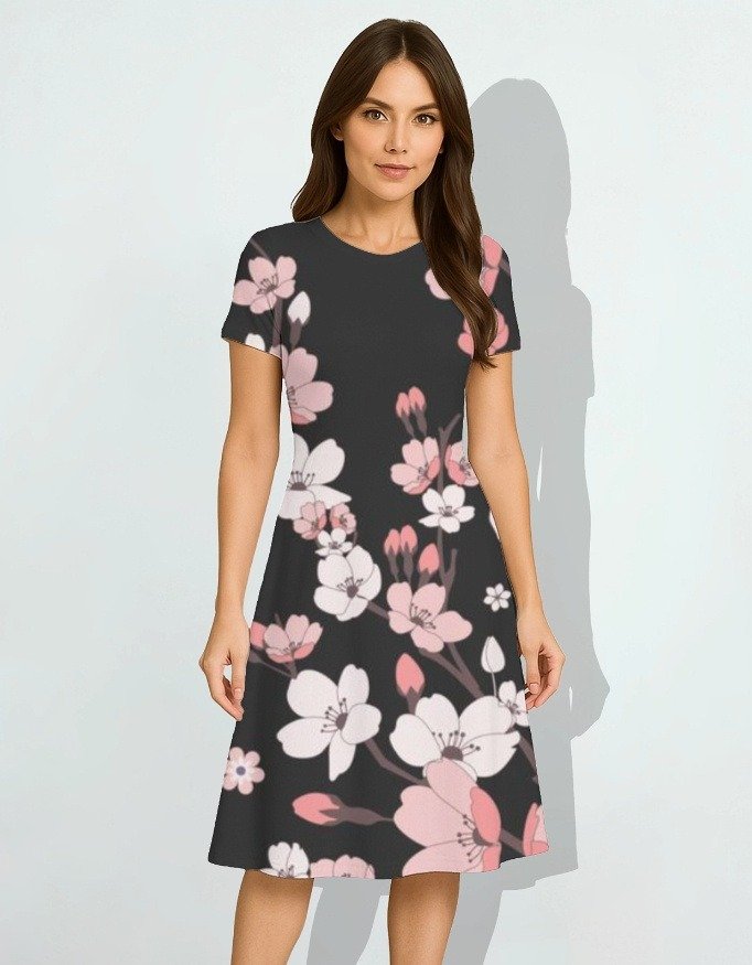 The flattering fit-and-flare silhouette gently contours the upper body while flowing gracefully through the skirt, offering ease of movement and a universally flattering shape. Finished with short sleeves and a clean, midi-length hem, this dress is both stylish and practical—an effortless go-to for everyday elegance.