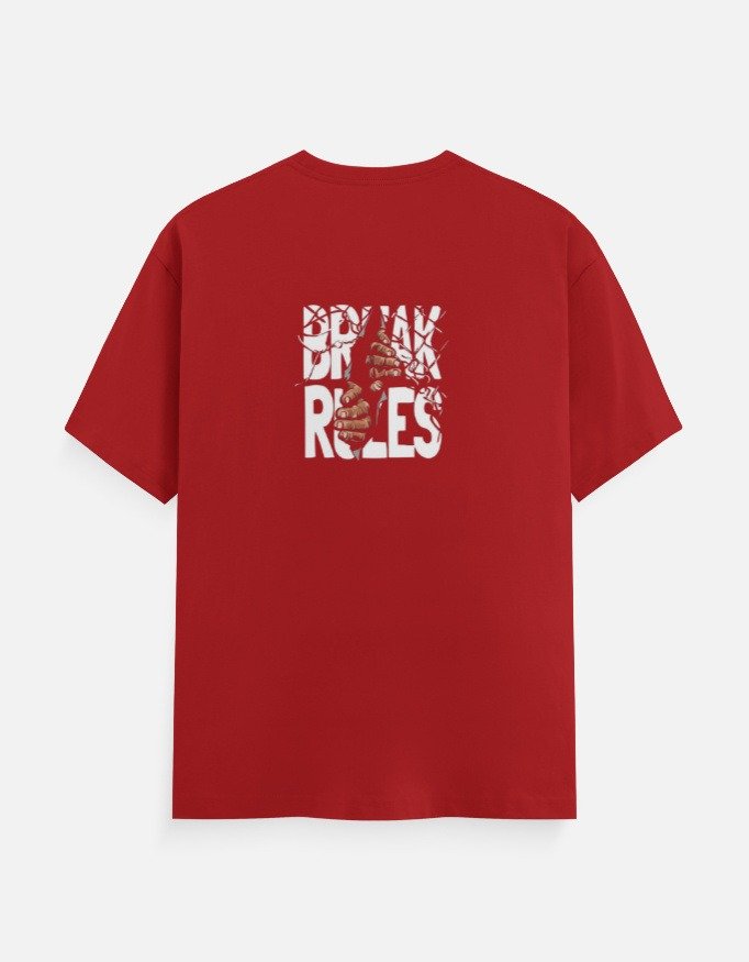 The back design showcases the phrase “Break Rules” in a striking cracked-text effect, creating a rugged, rebellious aesthetic. The red fabric amplifies the boldness of the artwork, making this tee ideal for anyone who loves statement graphics, motivational edge, or expressive streetwear.