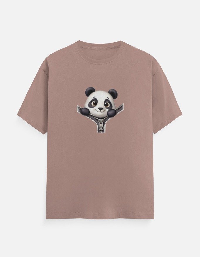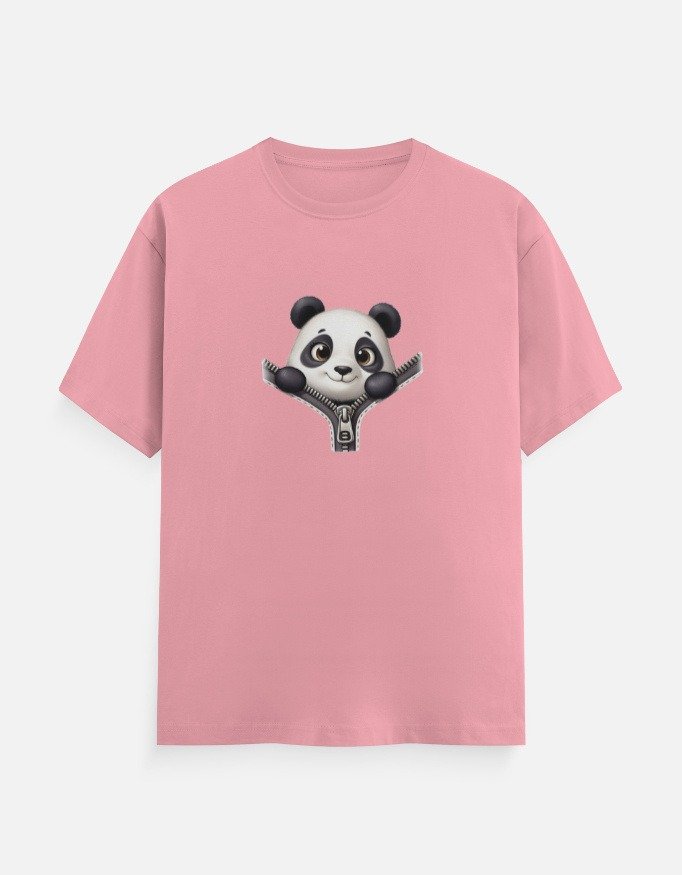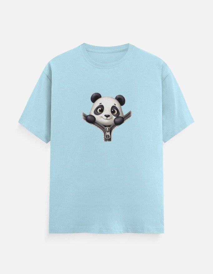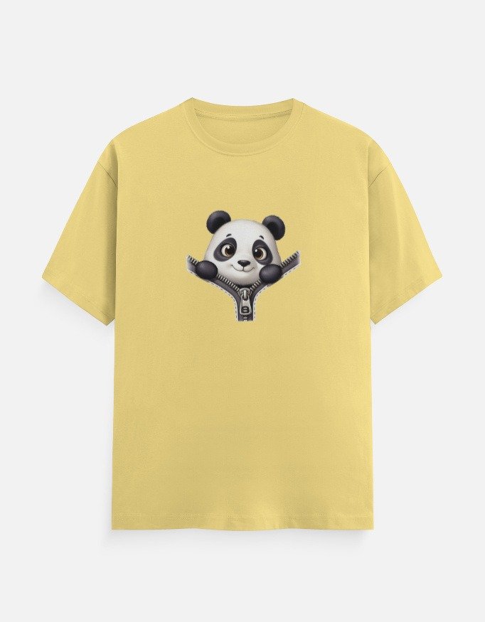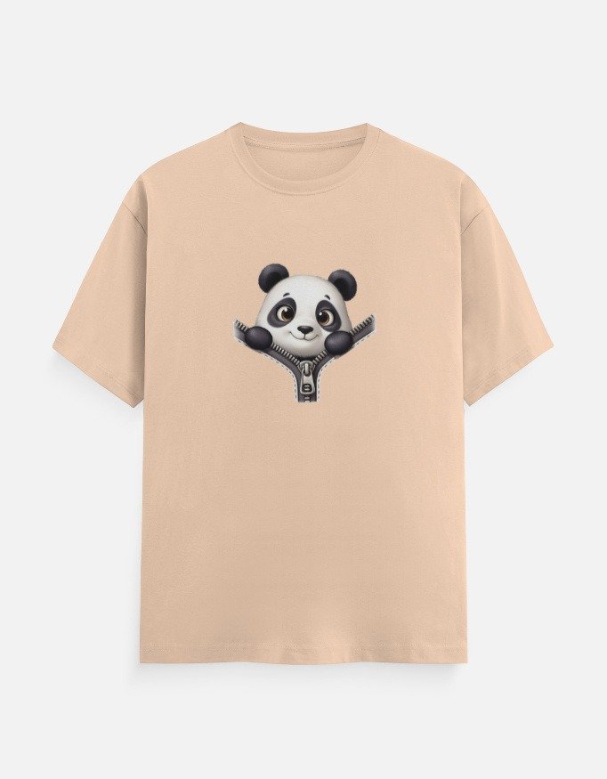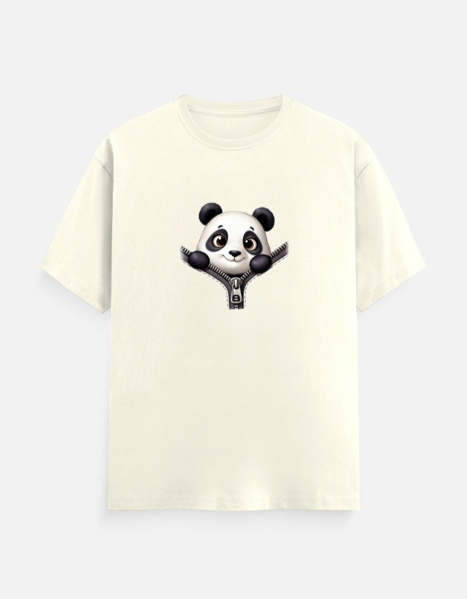 The front features a delightful illustration of a panda peeking out through an unzipped design, adding a fun and eye-catching touch that makes this T-shirt stand out. The soft fabric and clean silhouette pair effortlessly with jeans, shorts, or joggers for a relaxed, stylish look.