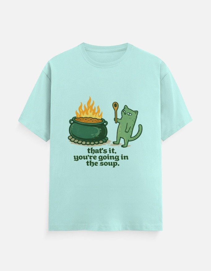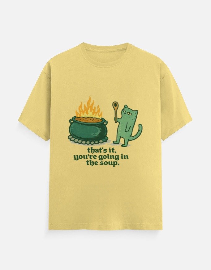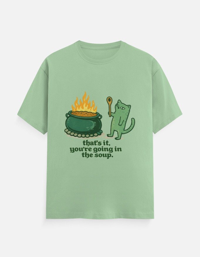 • Funny Cartoon Graphic – Playful cat & soup illustration with witty text