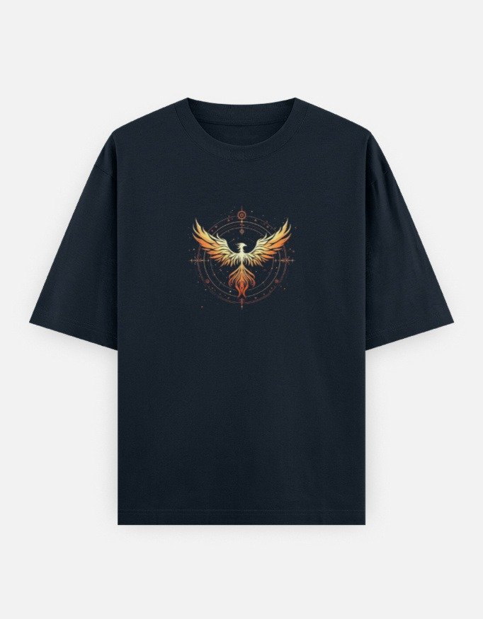 Showcase strength, rebirth, and bold style with this Oversized Phoenix Emblem Graphic T-Shirt. The tee features a beautifully detailed flaming phoenix design centered on the front, surrounded by subtle geometric elements that enhance its mystical and powerful look. Perfect for anyone who loves symbolic art or standout graphics with meaning.