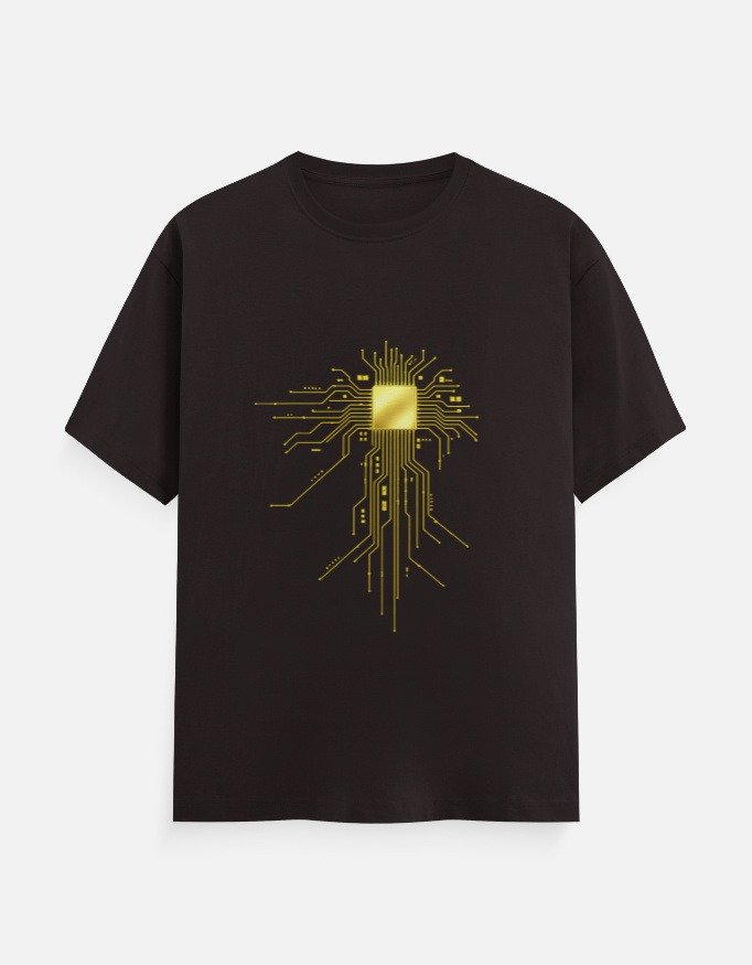 Power up your wardrobe with this striking tech circuit graphic t-shirt. Featuring a bold golden microchip-inspired design with flowing circuit lines, this tee blends modern technology aesthetics with everyday casual style. It’s clean, sharp, and effortlessly cool.