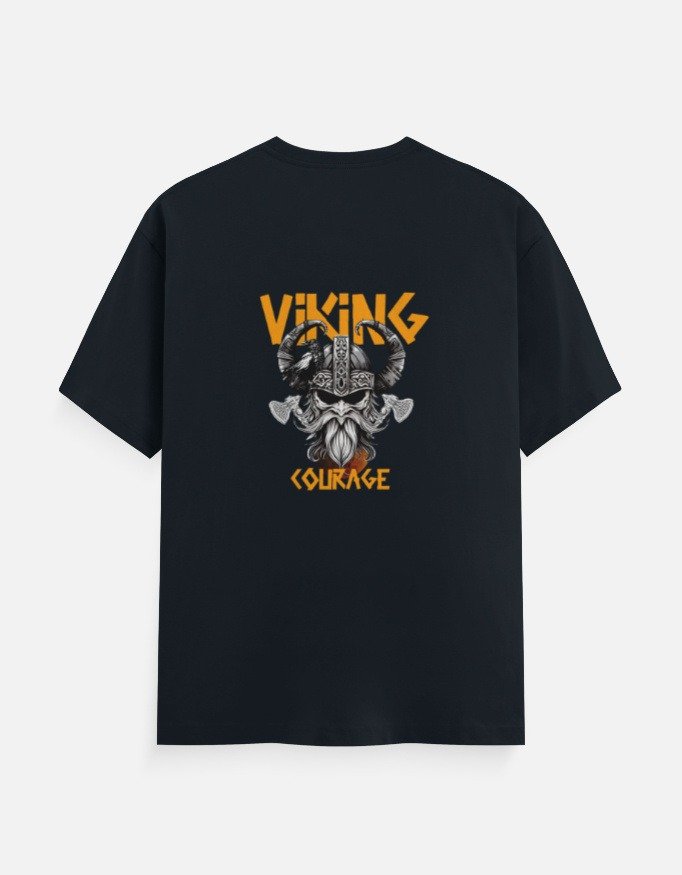 The back features an intricately detailed Viking warrior illustration complete with horned helmet, beard, and crossed axes. The bold orange “Viking” and “Courage” text enhances the design with a rugged, commanding presence. The dramatic artwork stands out strongly against the dark fabric, making this tee a perfect choice for mythology fans, Nordic-style enthusiasts, or anyone who loves strong graphic designs.